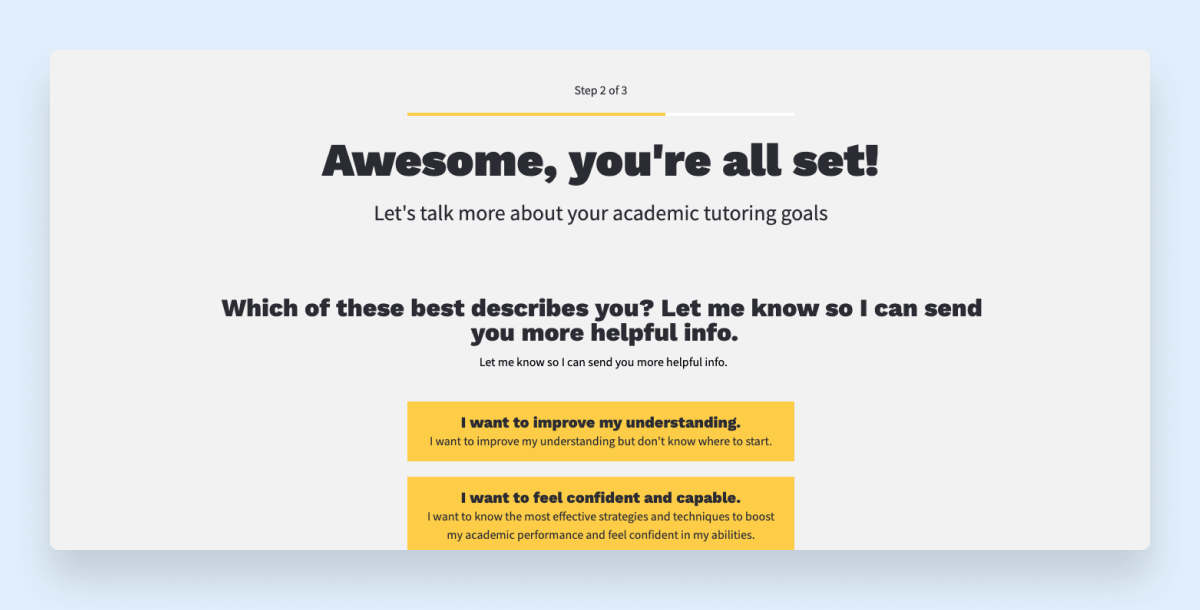 On the thank you page that displays after they sign up, they will select which of three pain points most applies to them. They will see one of three pages based on what they select. Those three pages are your opportunity to offer them valuable content (such as a video) and a call to action (to buy one of your products/services) tailored to that specific pain point. Your content should pitch your product or service as the solution to that problem.