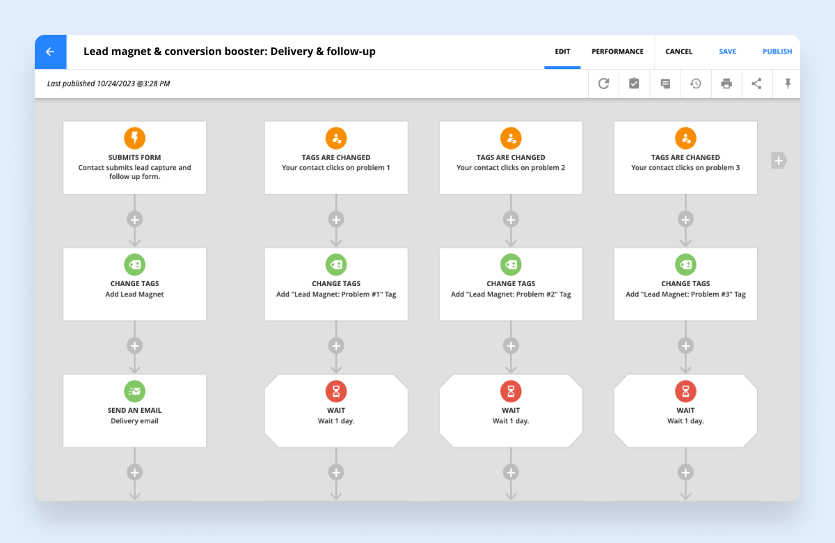In addition to the lead magnet delivery email, they’ll receive three emails (three days apart) containing information about their selected problem. After receiving all three emails, they’ll begin receiving a new sequence of emails based on the stay-in-touch drip email campaign. If leads don’t interact with your content (watch a video or click a link in your emails), the pace of emails they receive will slow. (Learn more about that system here.)