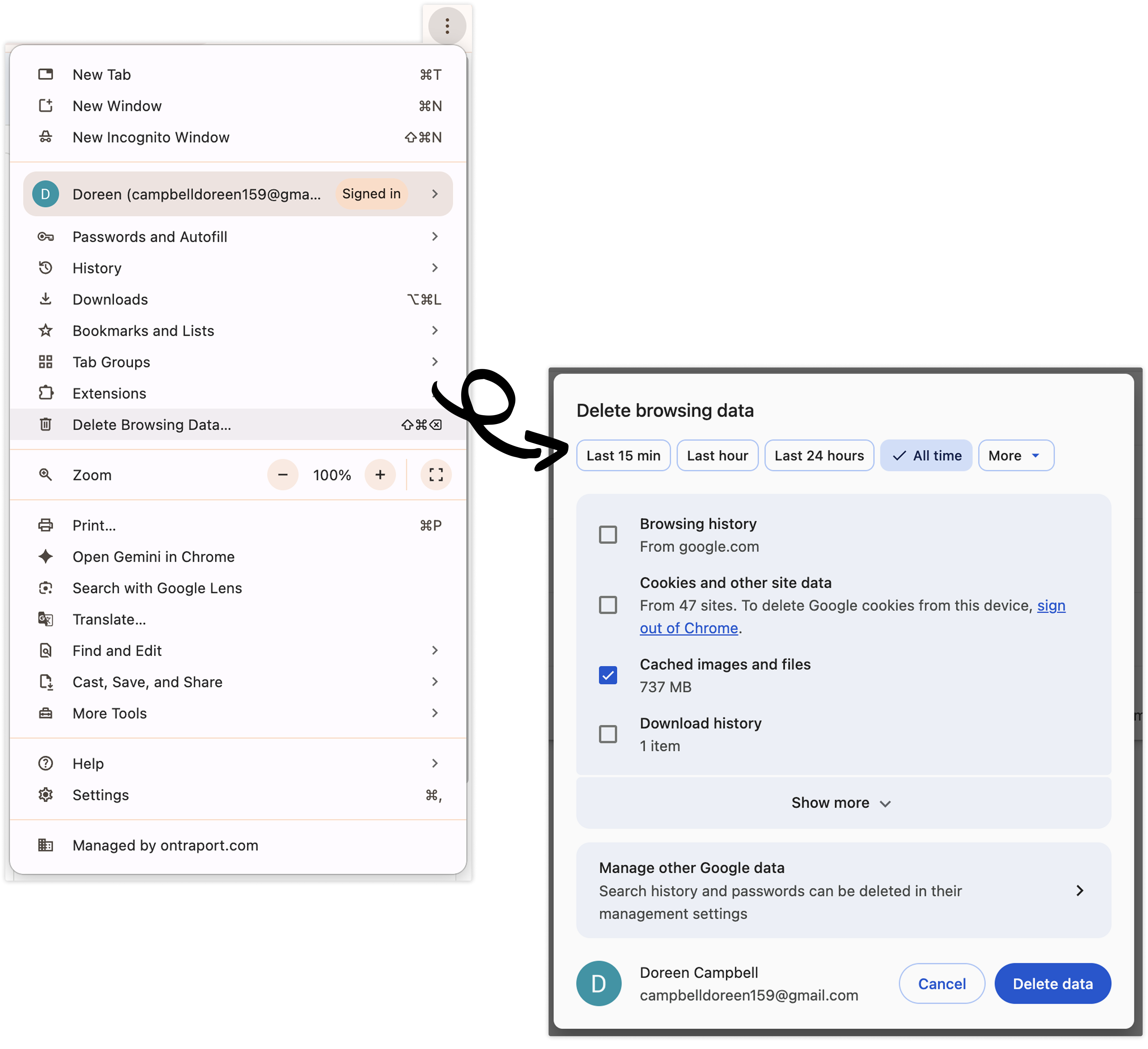 - Open Chrome, click the three dots in the top right corner → Delete browsing data. Then select the types of data you want to remove, such as cached images and files. Choose a timeframe and click Delete data. To see the changes, you can close and restart your browser.