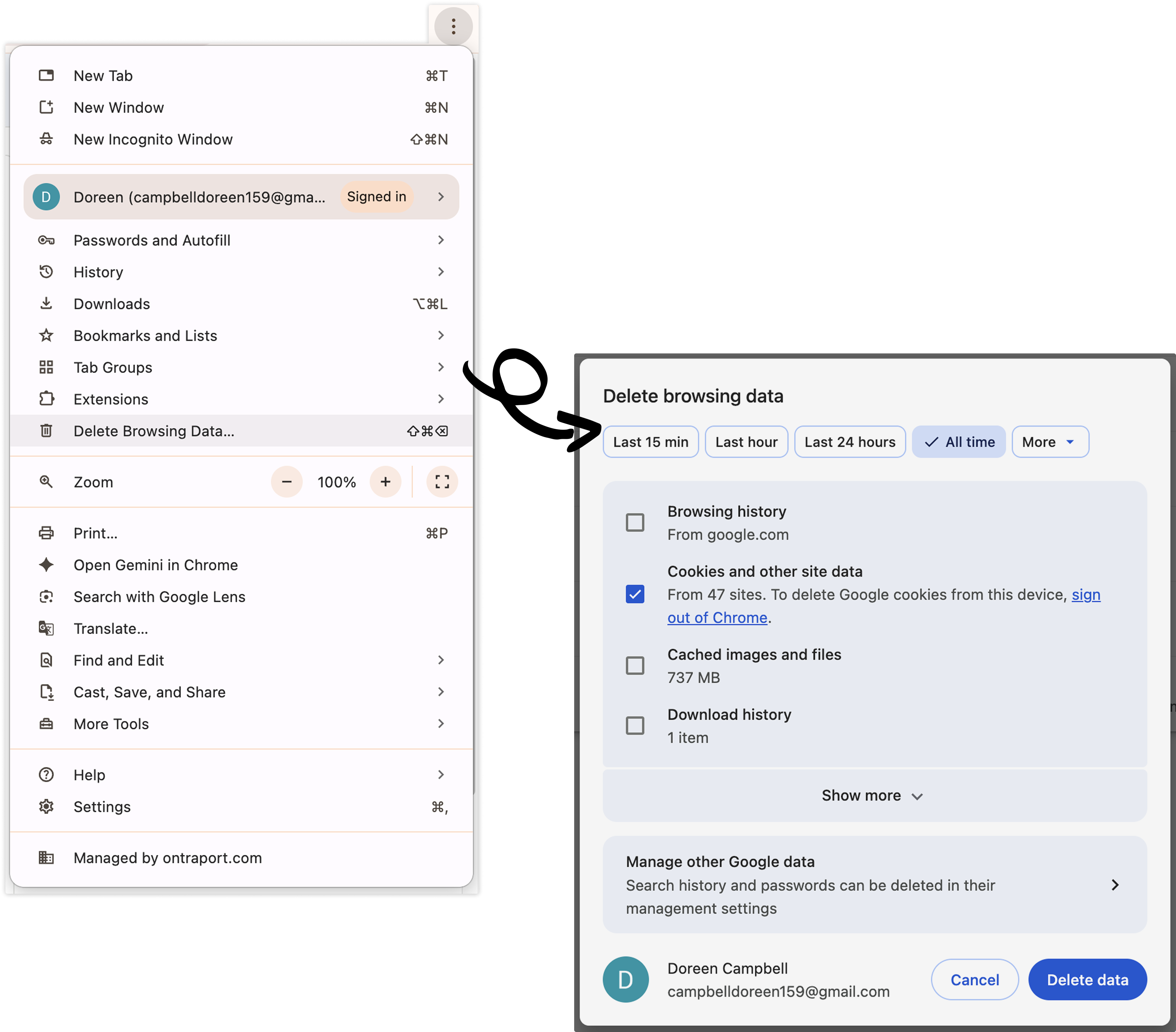 - Open Chrome, click the three dots in the top right corner → Delete browsing data. Choose a time range or select All time, then check “Cookies and other site data”, and click Delete data.