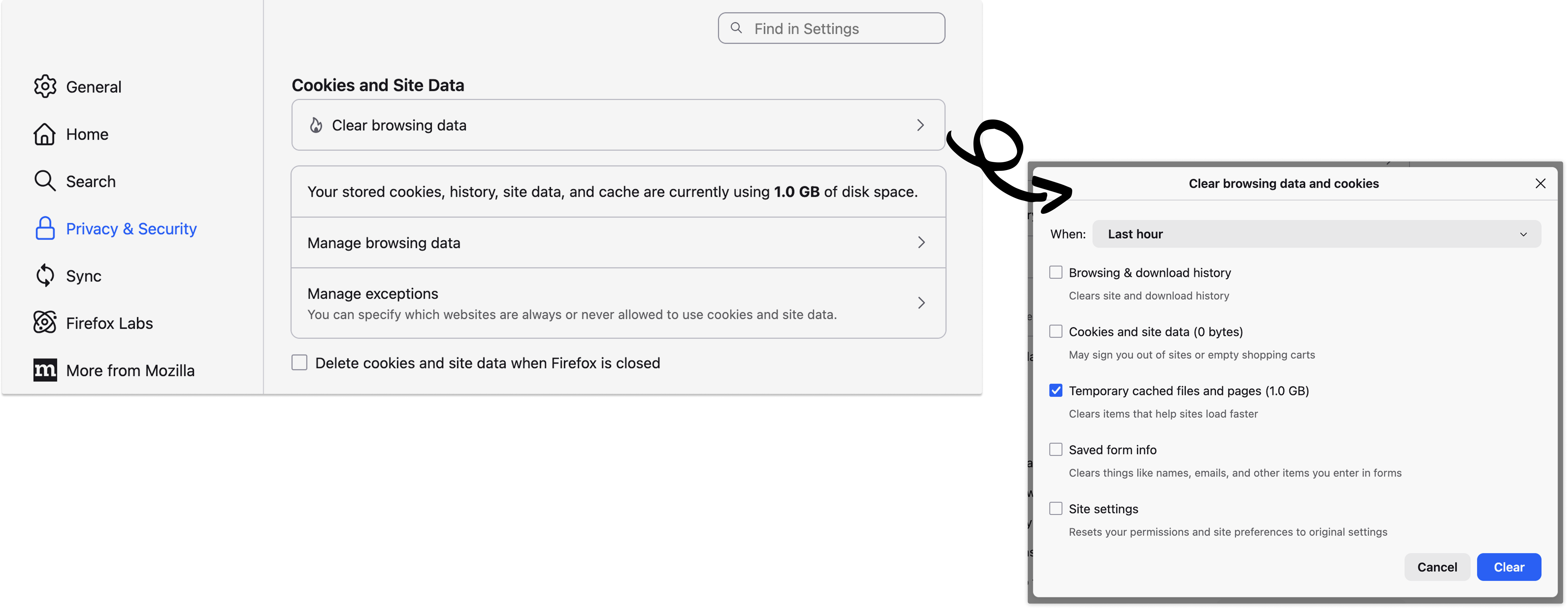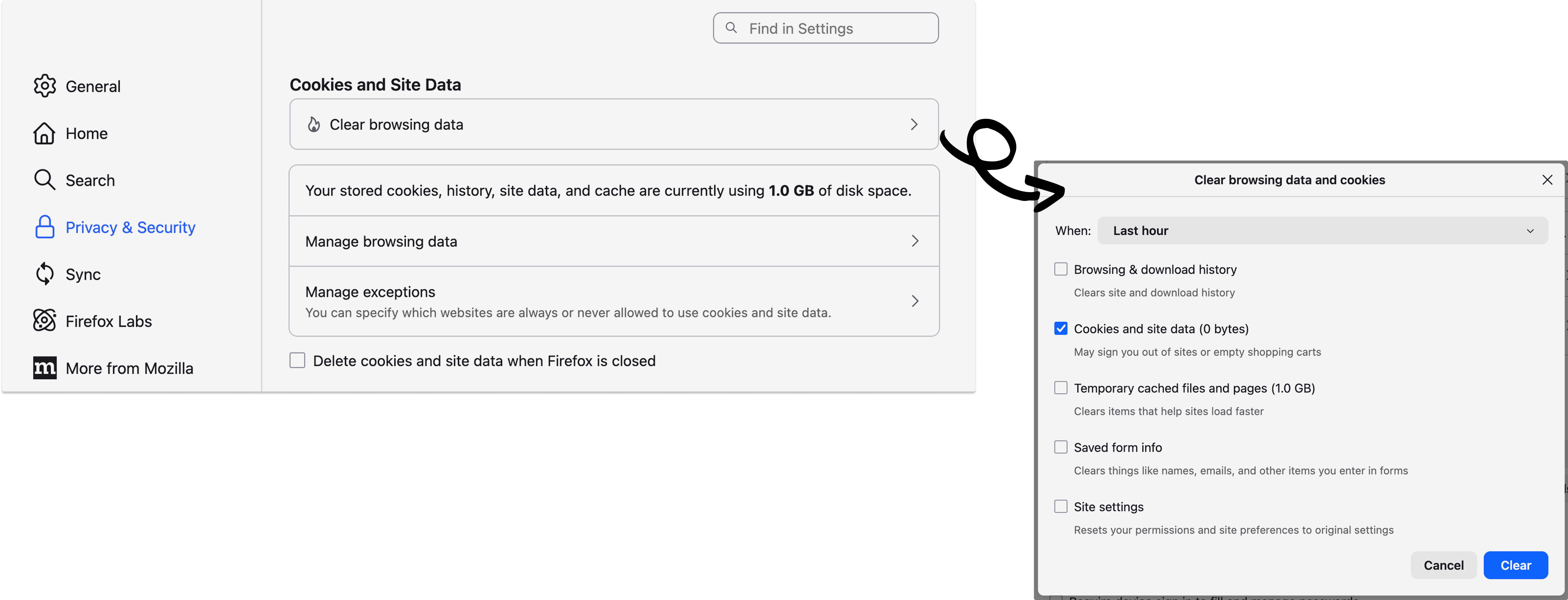 - Open Firefox, click the three lines in the top right corner → Settings → Privacy & Security. Scroll to the “Cookies and Site Data” section and click Clear browsing data check Cookies and site data. Then click Clear now. Close all open instances of Firefox.